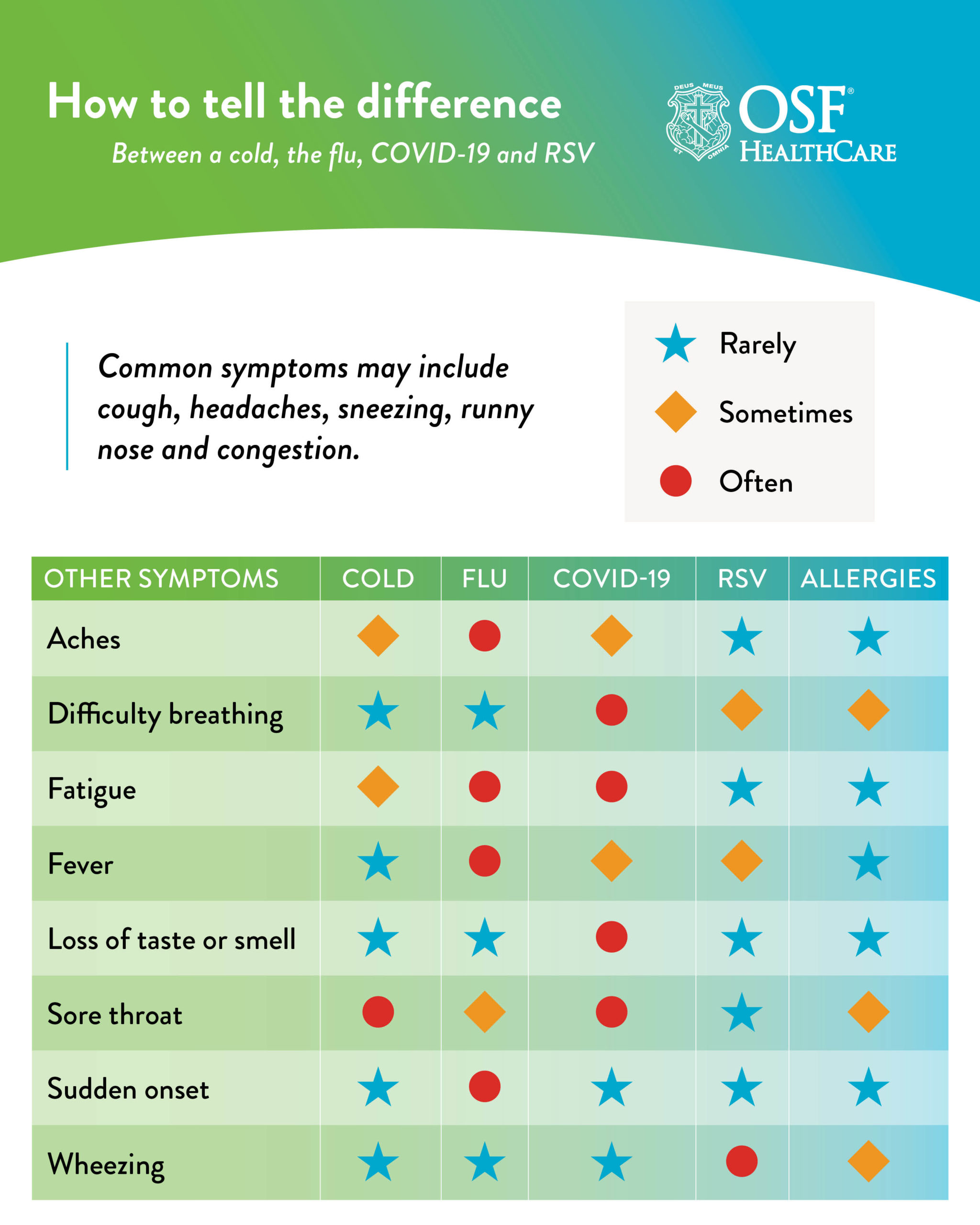 In most cases, these illnesses are all treated with rest, fluids and symptom relief. But some conditions, like COVID-19, RSV, colds and the flu, can progress more quickly, especially in young children, older adults and people with chronic conditions. Knowing what you’re dealing with helps you monitor symptoms, lower the spread and get the right care sooner.